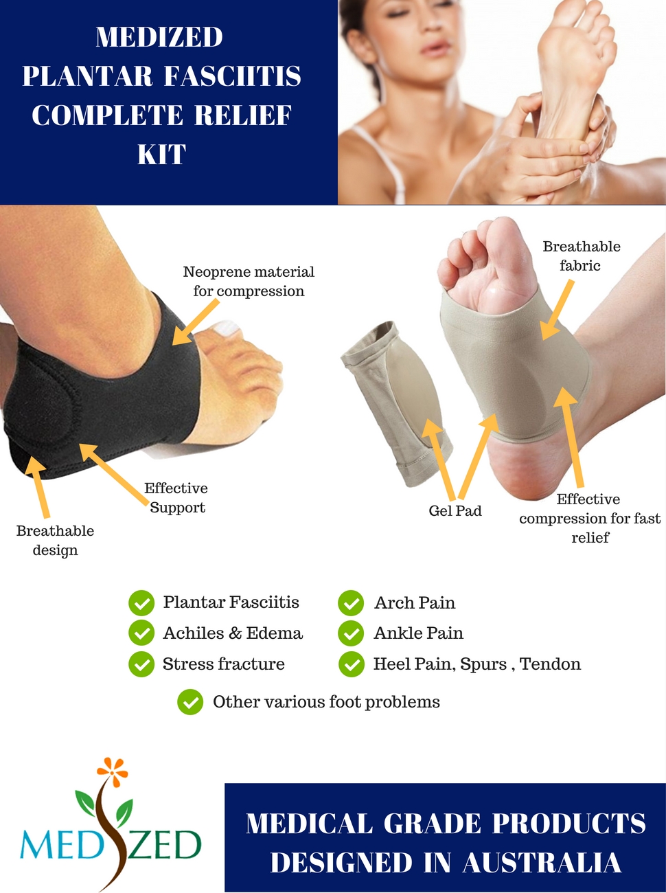 MEDIZED KIT FOR PLANTAR FASCIITIS AND ARCH PAIN. A COMPLETE KIT THAT HELP HEALING PAIN AND OTHER FOOT RELATED PROBLEMS.