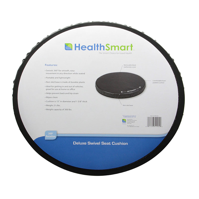 Convert any Chair into a Swiveling ChairEffortlessly swivel in your seat and reduce hip and back pain when getting up from your chair or exiting your car . The HealthSmart Deluxe Swivel Seat Cushion turns a full 360 degrees making it easy to swing your legs in the right direction. The cushion gives you soft customized comfort while you are seated. It also helps to reduce the pressure point sensitivity that can cause pain. Chronic pain sufferers will tell you that every extra movement can cause them discomfort. This cushion can minimize the stress on your back that occurs from twisting and turning to get out of your seat. Features Convert stationary chairs into swiveling chairs to reduce the strain on your back and hips. /li The seat cushion swivels 360 degrees for smooth easy movement in either direction. /li Great for home office or travel use; easily get in and out of vehicles /li Portable and lightweight yet supports up to 300 pounds /li Non-skid flexible swivel base contours to seat and stays in place /li Removable cover easily wipes clean. /li 15 inch diameter; 1 3/8 inch thick foam /li /ul